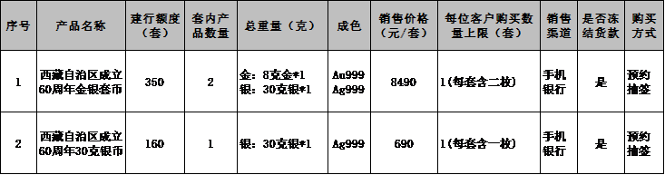 关于“西藏自治区成立60周年金银纪念币” 产品销售的公告